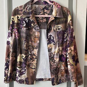 Lightweight with some stretch. Comfortable and versatile enough to be a blazer or jacket and worn open or closed.