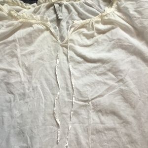 Gauzy white peasant shirt from Old Navy. 100% cotton. Loose fitting. Raglan sleeves. Gathered neckline with tie closure. 3/4 sleeves with elastic & ruffled cuffs. In very good used condition. Slight yellowing around neck.