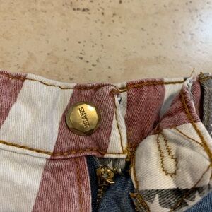 * Features: American flag print, stars and stripes, distressed details, frayed hem, button and zip fly closure.
