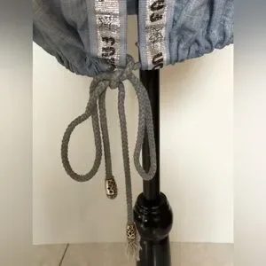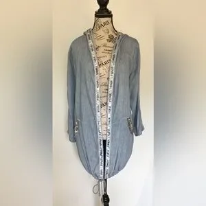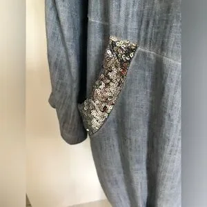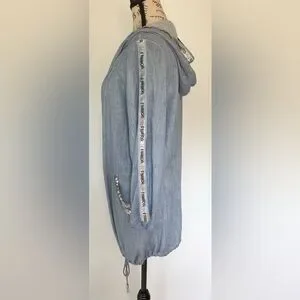 Accented with silver sequins on pockets and a silver ribbon along the hood, down the front and down the sleeves.