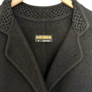Geiger - made in Austria, elevate your wardrobe with this Women's Black Boiled Wool Jacket. This elegant piece features intricate detailing and a classic design, 4 button double breasted, perfect for any occasion. Has all buttons and an extra one on the inside. In very good pre owned condition.