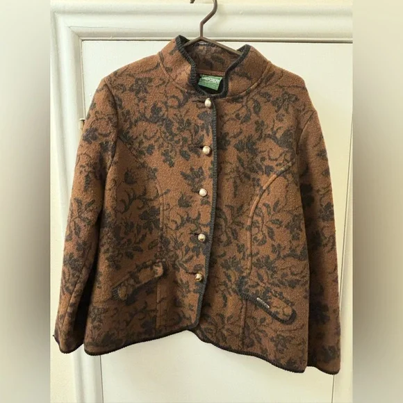 Geiger Collection Made in Austria boiled wool jacket size 44 in brown and black pattern.