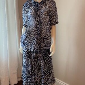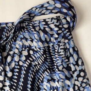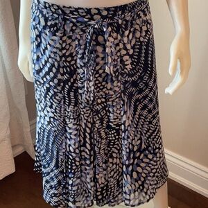 Matching skirt; lined, flowy, front and back centre pleats, tie belt- attached, side zipper closure, waist measured flat 20 inchs, length, 28 inches.