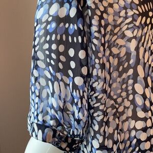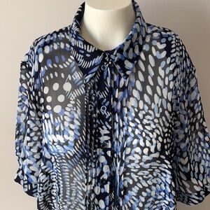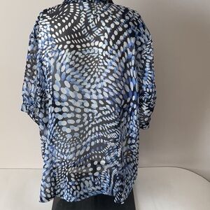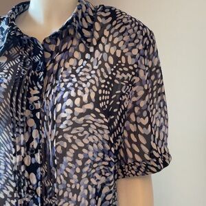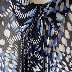 Blouse is sheer; collar, buttons, front pleats, shoulder pads short sleeves with cuffs. Note there is a small pull behind the neck. see last photo. Pit to pit 25 inches.