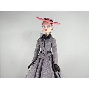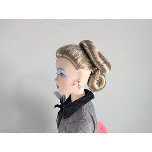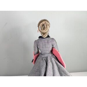 A delightful Gene Marshall collectible doll, dressed in an elegant 1947 Post-war New Look inspired grey tweed jacket and flowing circle skirt designed by renowned fashion artist Jose Ferrand. She has pink "suede" accessories, a bag and hat, pink earrings and elegant high heeled shoes. She is even wearing actual tights and sheer black gloves. She comes in an original Gene Doll box with plastic stand, booklet and numbered Certificate of Authenticity (#06) The doll is made of a harder plastic and she is one of the earlier models as her arms and legs do not bend. This doll was brought out by the Ashton-Drake Galleries which made these dolls between 1995 and 2005. Made in China.