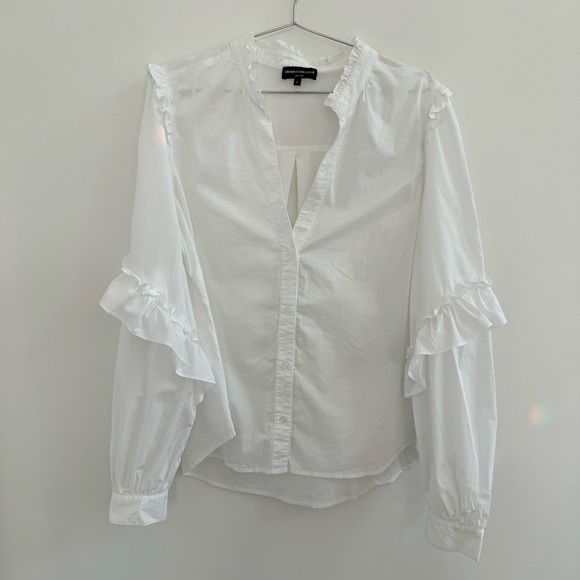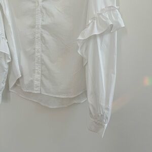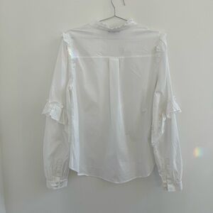 Elegant white blouse with ruffle details. Long sleeves with button cuffs. V-neckline with subtle frill trim.