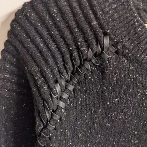 Contrast leather stitching details the seams of this speckled Generation Love sweater. Ribbed shoulder panels add cool texture. Asymmetrical hem. Crew neckline. Fabric: Fine knit. 80% wool/20% nylon. Dry clean.