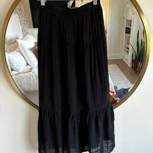 Tiered black skirt. Never worn. High waist. Size XS. 100% Rayon. Lined. Mid-shin length.