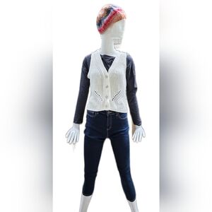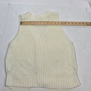 Sweater vest, V=neck with delicate open knit pattern. Cream colored, boxy, layers well. small
