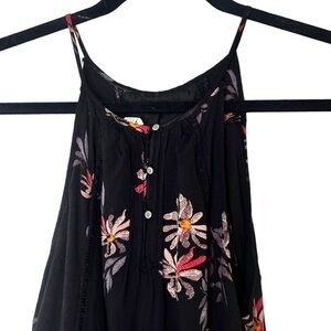 Pretty floral print sleeveless boho shift dress with a higher neckline, pintucking detail, lattice trim at sides of chest, and button fastening at back. Very reminiscent of slip dresses from Free People.