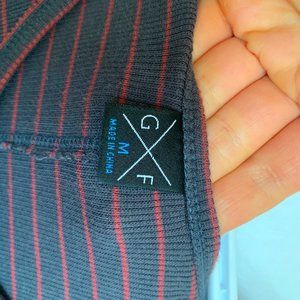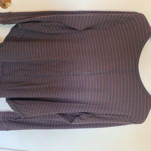 Gray with plum stripes, button detailing, medium, good condition, 48% polyester, 28% cotton, 18% modal, 6% spandex