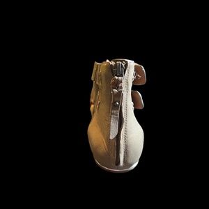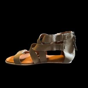 NWOT Gentle Souls gladiator type sandal in size 11M. Features leather souls, footbed and upper with pewter coloured hardware. Zipper closure at back, note that toe strap is not adjustable and not suitable for wide feet. Have been worn/tried on indoors but have not been worn outdoors. Leather has slight markings/distressed looking as intended by manufacturer. No defects.