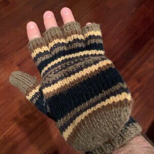 These mittens/gloves have literally crossed the globe! Made in Bolivia and purchased in Tokyo, they now find themselves in Canada! They convert from mittens to fingerless gloves. Very little use means they're practically "like new" without tags. There's also a thumbhole to aid when texting too! No size is indicated but I'd say they're size M