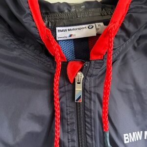 Dark blue BMW logo windbreaker, full zip front, hood, Like new condition.