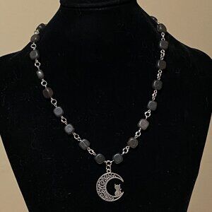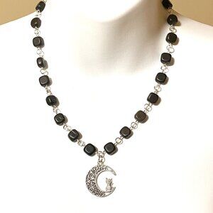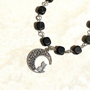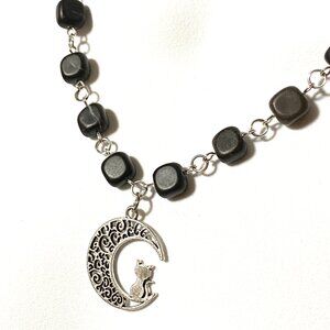 Genuine Black Agate Cube Necklace, Cute Cat on the Moon Pendant + Gemstone