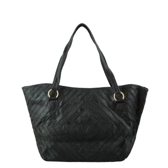 Genuine Black Leather Tote with Patchwork and Metal Rings