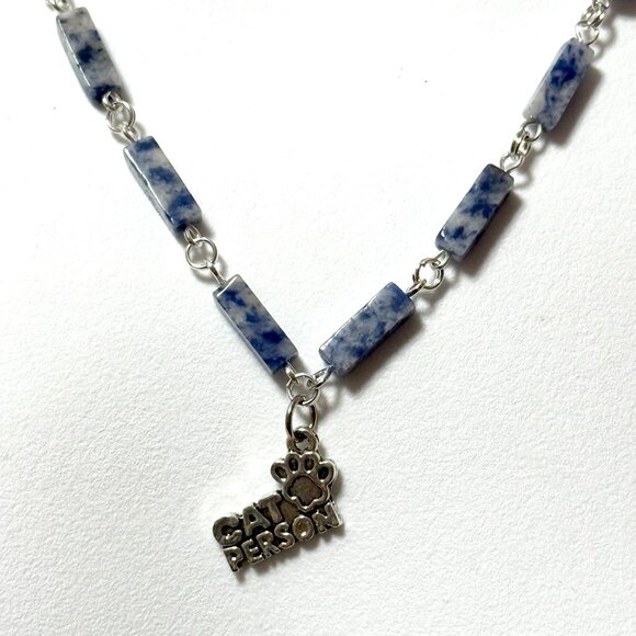 Genuine Blue White Sodalite Matinee Necklace, Gemstone & Cat Person Paw Print Charm