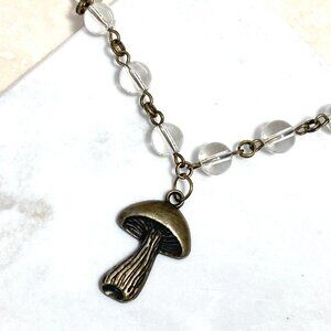 8 mm clear quartz round beads, 19 mm x 30 mm bronze mushroom pendant