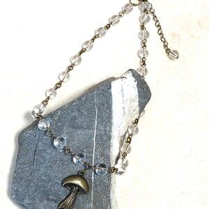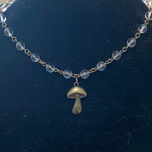 Genuine Clear Quartz Short Necklace, Bronze Slim Mushroom + Natural Gemstone