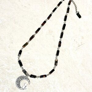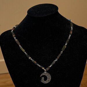 Genuine Dark Green Ocean Jasper Short Necklace, Gemstone & Cat on the Moon Charm