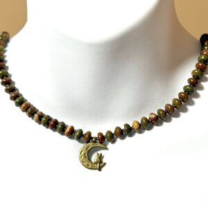 Genuine Earthy Polychrome Jasper Bronze Cat on the Moon Beaded Short Necklace