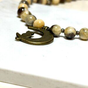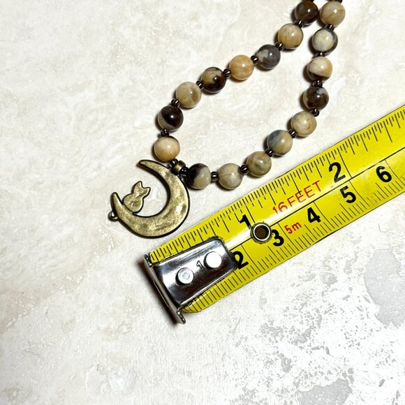 Genuine Earthy Septarian Stone Bronze Cat on the Moon Beaded Short Necklace