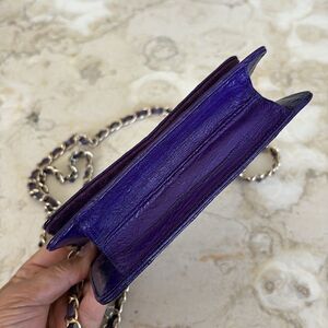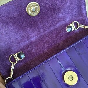 In excellent preowned condition pretty vintage eel skin mini bag with woven gold tone chain and leather strap. Classic styling in gorgeous buttery soft purple leather. Magnetic snap closure, leather lined interior with a zippered pocket.