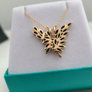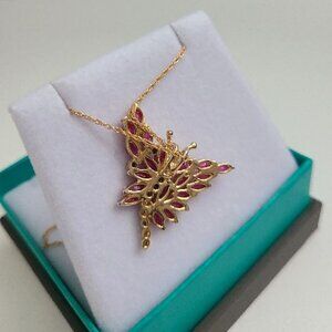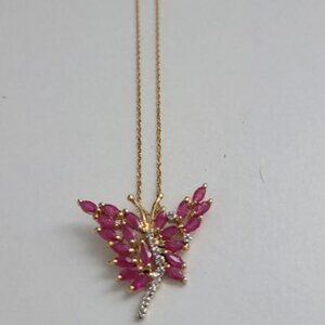 This is a lovely, Ruby butterfly pendant created with (20) 5X2.5mm genuine faceted rubies and small diamonds, 07 carat tw. These are not lab created stones, but authentic gemstones. This stunning pendant has 4.3 grams of sterling Silver layered with 18K Gold. The sterling silver stamp is located on the back of the pendant. The exquisite butterfly width is 1 1/8 inches or 27mm and the height is 1 1/4 inches or 29mm. The dainty chain is 18" in length. Quality made.