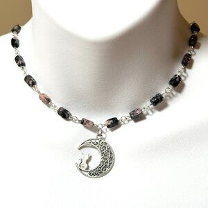 Genuine Gemstone Black Pink Rhodonite w/ Cat on the Moon Pendant Short Necklace