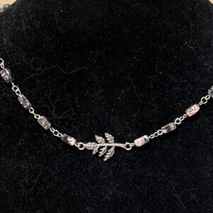 Genuine Gemstone Black Pink Rhodonite w/ Silver Leaf Branch Charm Short Necklace