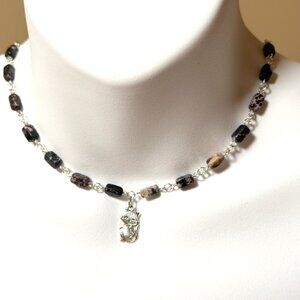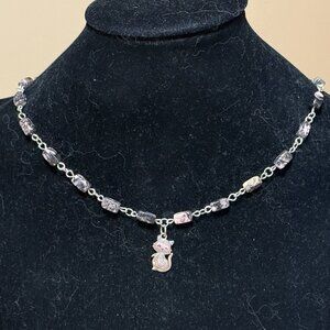 Genuine Gemstone Black Pink Rhodonite w/ Smiley Face Cat Pendant Short Necklace