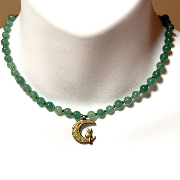 Genuine Gemstone Green Chalcedony Bronze Cat on the Moon Beaded Short Necklace