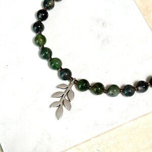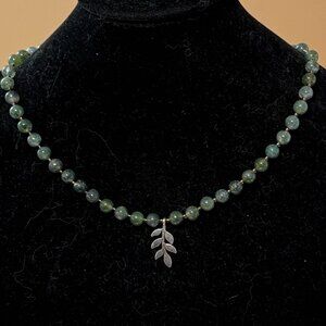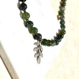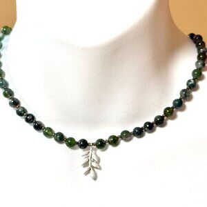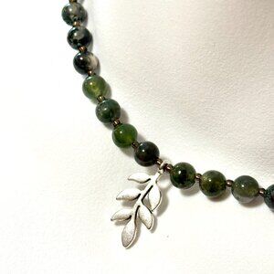 Genuine Gemstone Green Moss Agate Silver Leaf Branch Beaded Short Necklace
