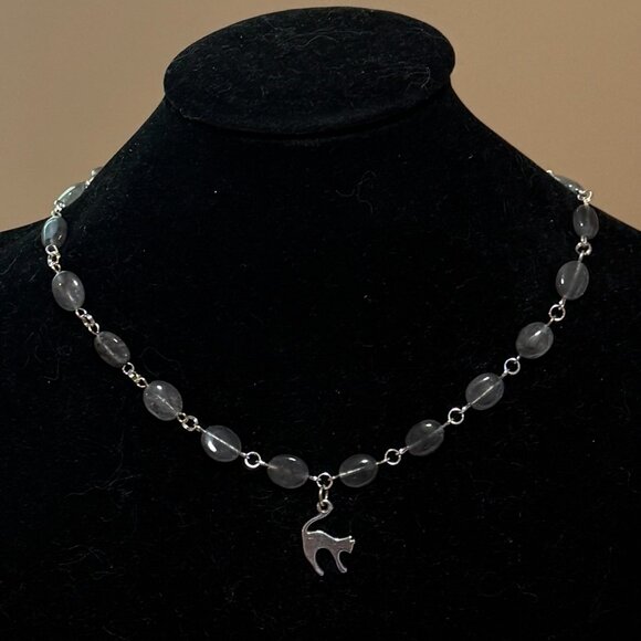 Genuine Grey Tourmalinated Quartz Short Necklace, Gemstone w/ Slim Cat Pendant