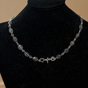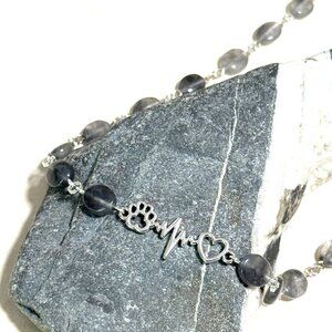 Genuine Grey Tourmalinated Quartz Short Necklace,Gemstone & Paw Print Heart Beat