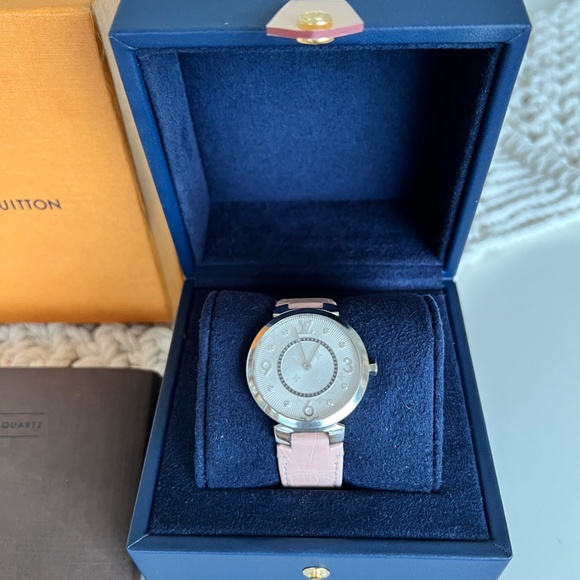 This is a beautiful ladies LOUIS VUITTON Tambour Slim watch in gently used, pre-loved condition.