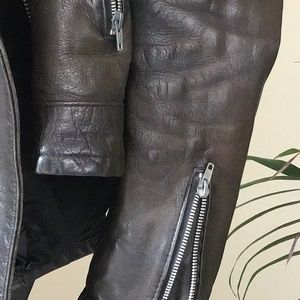 Genuine vintage black leather The Old Mill Glen Laine Bainton crop coat. Side zipper pockets and many detailed zippers including wrist closures. Wide collar with metal button and zipper front closure. Beautiful condition, fits medium to large on 5”8 model.
