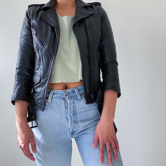 Cropped real leather biker jacket. Black with gunmetal hardware. Would fit an xxs-xs, not a lot of give in the leather. From H&M’s premium quality line