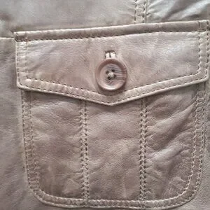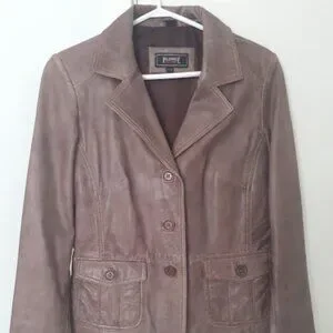 A lightly used women's leather jacket in a soft mouse brown colour. The Large size fits more like a medium. Plongé leather jackets are made by Plongé Leathers, a Canadian brand established in 1992. These jackets are crafted from high-quality materials, including lightweight 100% lambskin sourced leather, ensuring durability and comfort. The lining is polyester with one interior pocket. Measurements: shoulders - 16 inches, sleeve - 24 inches, length - 24 inches.