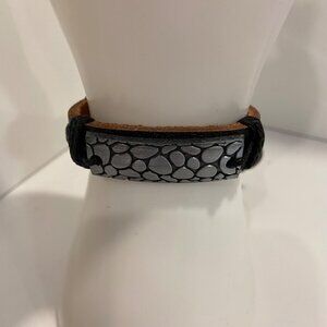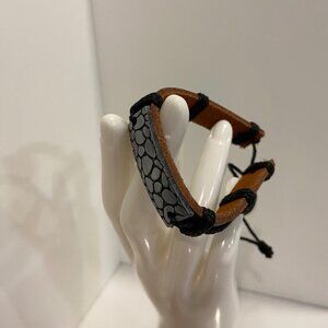 This adjustable bracelet features a unique textured animal print metal accent, complemented by a leather and rope design, offering both style and comfort.