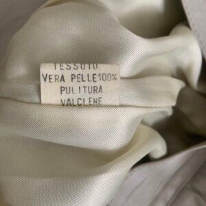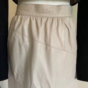 tags: leather skirt, italian fashion, classic style, minimalist chic, neutral tones, elegant wardrobe, timeless piece, small size skirt, below the knee, fully lined, side zipper, versatile look, real leather, gift item, unique color, fall fashion, winter staple, feminine style, pre-loved, excellent condition