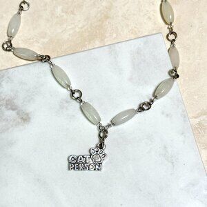 12 mm x 6 mm milky quartz barrel beads, 3/4" (21 mm) silver color "Cat Person" pendant