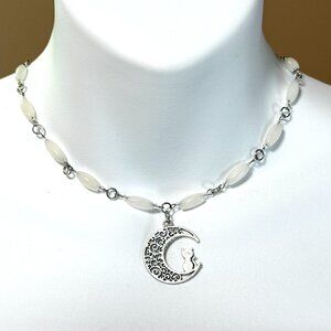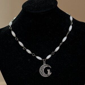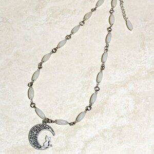 Genuine Milky Quartz Short Necklace, Natural Gemstone w/ Cat on the Moon Pendant