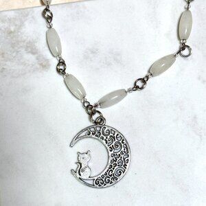 12 mm x 6 mm milky quartz barrel beads, 30 mm silver color "Cat on the Moon" pendant