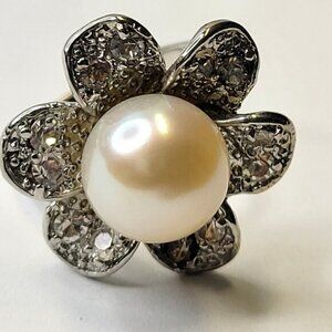 Genuine Off White Pinkish Pearl and Swaroski Flower Ring Size 7.5