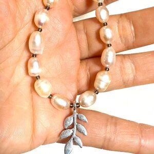 Genuine Pale Pink Freshwater Pearl Silver Leaf Branch Beaded Short Necklace