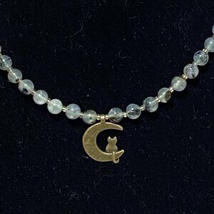 Genuine Prehnite Bronze Cat on the Moon Necklace, Gemstone Beaded Necklace