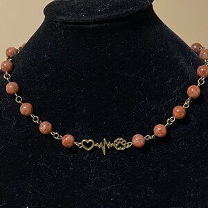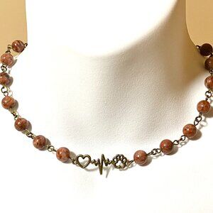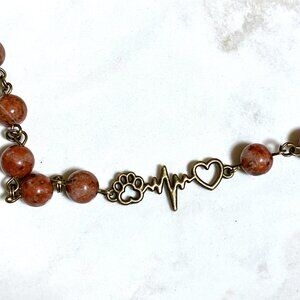 Genuine Red Jasper Short Necklace, Bronze Paw Print Heart Beat +Natural Gemstone