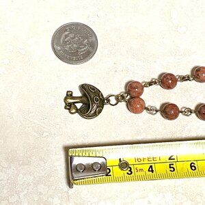 9 mm red jasper round beads, with natural dark speckling and polished to a glossy finish; 23 mm (about 1") round mushroom bronze pendant