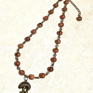 Genuine Red Jasper Short Necklace, Cute Bronze Round Mushroom + Natural Gemstone
